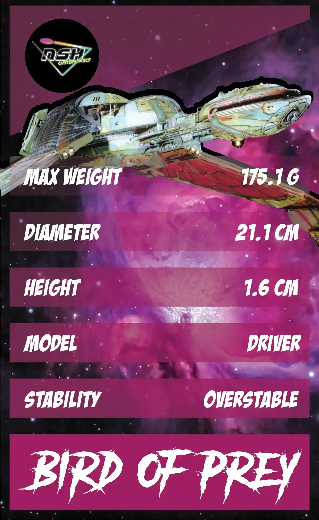 Origin: Inspired by the legendary Klingon Bird of Prey — a symbol of strength, honor, and advanced battle tech. This disc reflects that legacy with a double-rimmed distance driver design made for competitive flight.