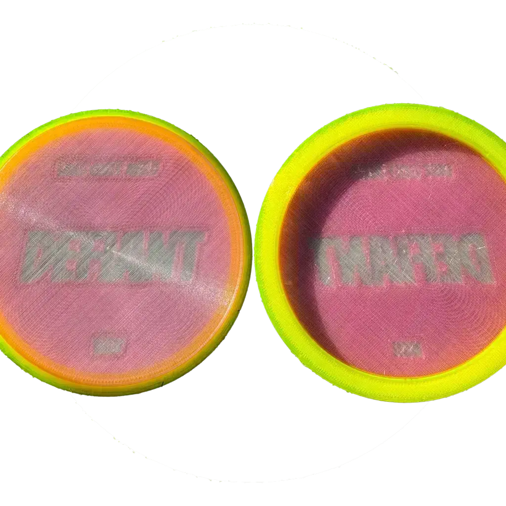 The Disc Golf Nerd Defiant is a pink and yellow tour series edition of our glidey, understable putter — featuring custom artwork created by Disc Golf Nerd himself. It’s smooth, reliable, and full of personality, just like Justin’s disc golf style.